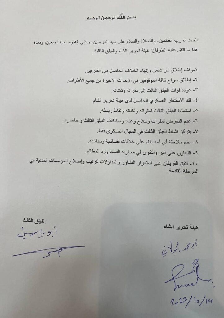 ونشرت معرفات الفيلق الثالث صورة قالت إنه اتفاق تم مع هيئة تحرير الشام، لتحذفها لاحقاً، وتضاربت الأنباء عن مدى صحتها.
